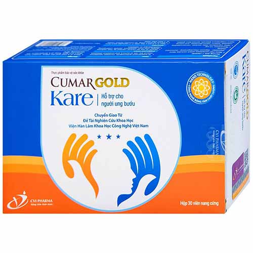 Cumargold kare là thực phẩm bảo vệ sức khỏe giúp hỗ trợ tăng cường miễn dịch, giảm mệt mỏi đồng thời hỗ trợ giảm tác dụng phụ của hóa xạ trị như nôn ói, mệt mỏi, chán ăn, sụt cân. Cumargold Kare sử dụng với những người bị ung thư bướu, người đang và sau quá trình hóa trị, xạ trị. Người muốn giảm nguy cơ mắc bệnh ung bướu do gốc oxy hóa gây ra. Cumargold Kare là sản phẩm được sản xuất bởi Công ty Cổ phần Dược Trung Ương Mediplantex. Mediplantex với hơn 50 năm xây dựng và phát triển, đóng góp cho sự nghiệp chăm sóc sức khỏe bệnh nhân.